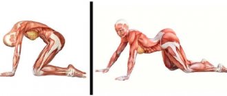 The “fold” exercise is very useful for stretching the back and leg muscles. We sit on the floor. We stretch our legs forward. Bend down to your feet and, bending your knees, clasp your feet with your hands. Press your stomach to your thighs. Inhale, and as you exhale, begin to straighten your legs. We don’t separate the belly from the hips. Let's look ahead. The back is straight. At maximum extension, breathe calmly 3-5 times. With each exhalation, continue to gently straighten your legs. In a couple of weeks, you will be able to straighten them completely.