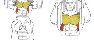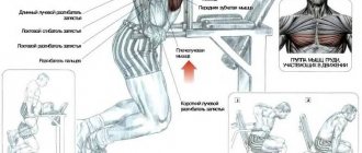 - Грудные мышцы развивает жим гантелей, выполняемый на скамье в лежачем положении. Также с этой целью необходимо разводить руки, удерживающие гантели.